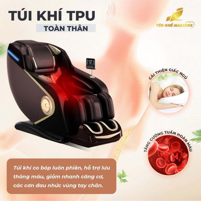 Túi khí toàn nhân, êm ái tựa mây: Hệ thống túi khí trải đều trên ghế massage, xoa bóp cơ thể đồng thời, giúp kích thích lưu thông máu, giảm căng cứng cơ bắp, và giúp người dùng thư giãn một cách toàn diện. Tính năng này cung cấp massage đồng bộ cho cả những vùng không thể tiếp cận bằng con lăn.